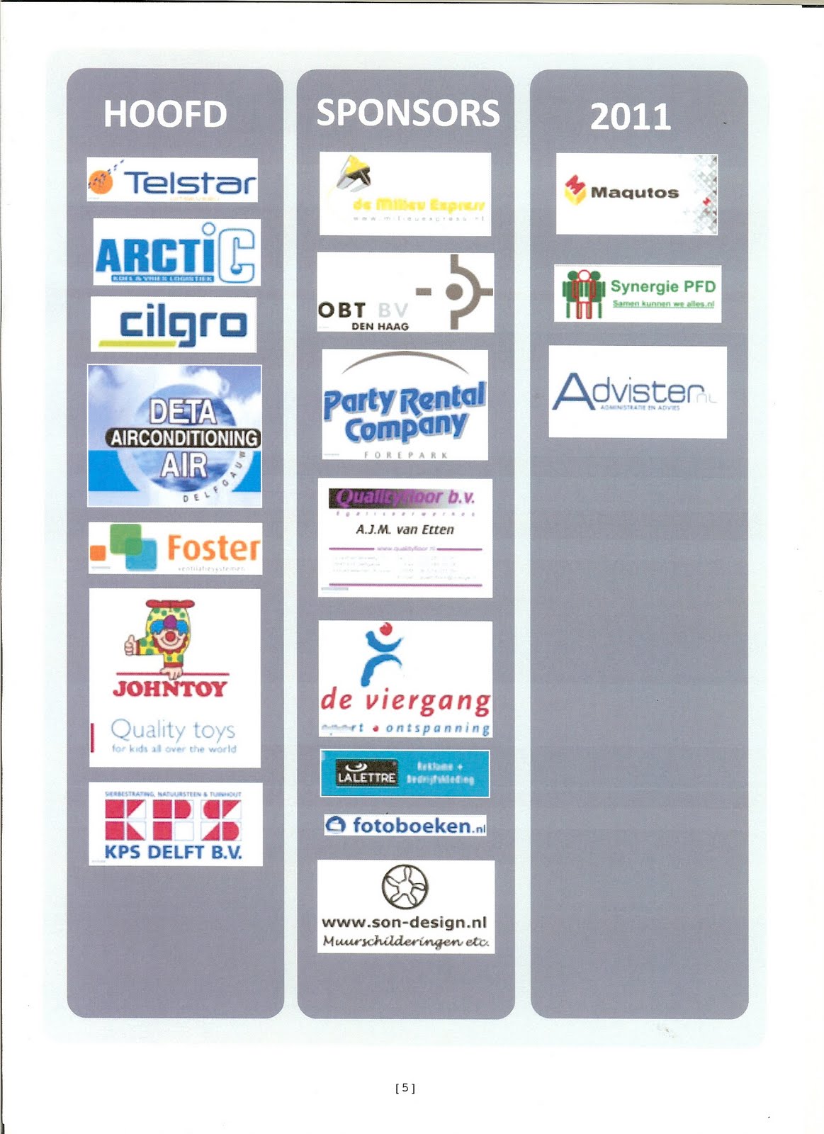 Arctic - Hans Post, Cor & Margreet Baan, Ada & Theo van Baar, BAS - Martin Burgers, Monique Bachofner, Hans Benenga, Marina Besselink, Peter Boogert, Bart & Pauline vd. Boogaard, Martine v.d. Boogaard, Ted & Dé de Braak, Jan Brak, Martin Breedijk, van Brero & Breugem Makelaardij, Henk Brilman, Frits Bruijn, Marc van Buijtene, Eric van Buren, Ton Cabaret, Cilgro, Patrick Derks - Nuttysporters, Deta-Air, Joke van Dijk, Kees & Anneke Doornheim, Drukwerkfabriek, Dave Earnshaw, Peter van Eick, Desirée Elens, Edith Fege, Angelique Finkers, Foster Ventilatiesystemen, Monique Gilissen, Wouter & Carla van Haaften, Ruud van Heijningen, Marc den Hoed, Hans van Hoolwerff, Dorine v.d. Horst, Willem Hus, Jacobine, Johntoy, Coen de Jong & Lucia Hazenberg, Gijs de Jong, Jan & Marion Joosten, Henk Karremans, Martin Kool, KPS Delft, Petra Kreft, Anja Krijgsman, Liesbeth & Niek Krouwel, Ruud Lapawa, La Lettre, Kees van Liempt -Interpresario, Wout van Liempt - Nederlands Theaterbureau, LMI Drechtsteden, Wendy Luchtmeijer, Maarten & Barbara Luk, Maqutos, Arend-Jan Meijer, Dhr Meijer, Moerland Verhuur, Enrique & Dieneke Morales, Esmee Nieuwenhuis, NoRisk-Keymanagement, OBT, Opa Erwin, Ronald Olsthoorn, Ben Oudshoorn, Pam & Theo, Party Rental Company, Azira Pieter, Ruud van Putten, Qualityfloor, Restore bv, Eva van Rooijen, Lars Roos, Ma Ros, Fred & Anja Ros, León Ros, Hein Runeman, Rob Sanders, Ronald van Schaik, Richard & Carla van Schie, Marieke van Schuppen, Shibu den Bezemer, Son Design, Johan Sosef, Goozina Steketee-Bijl, Synergie PFD, Telstar, Hans van Thiel, John Tieleman, Eugene de Veld, Marianne Veld-Ros, Frits van Velzen - ComputerPlan, Peter van Velzen & Kane, Theo & Bernice Visser, Henk Vlassak, Jackie van der Vlis, Ernestine & Jan Vos, Frans & Yvonne de Vries, Johan van der Waal, Henk & Loes Westerveld, Esther van Winden, Art & Irene van Winden,